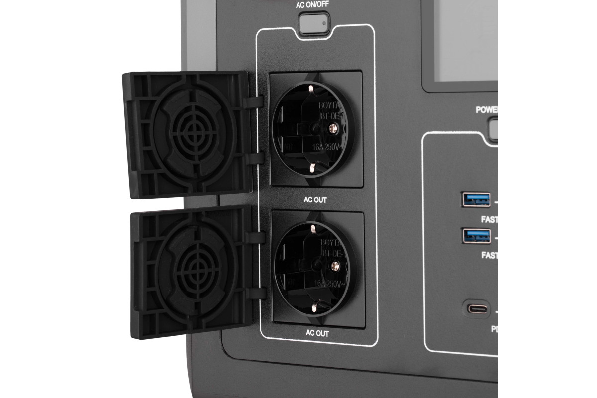 Від мережі 220В або Генератора – вхід змінного струму до 1200 Вт! Що дозволяє зарядити силову станцію від 0% до 80% лише за 60 хвилин! а до 100% всього за 1,5 години роботи від мережі чи генератора. При цьому зарядна станція не споживає пікову потужність на старті, а робить це дискретно, «міряючи» можливості мережі та не створює стартових пікових навантажень.